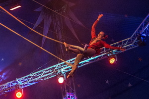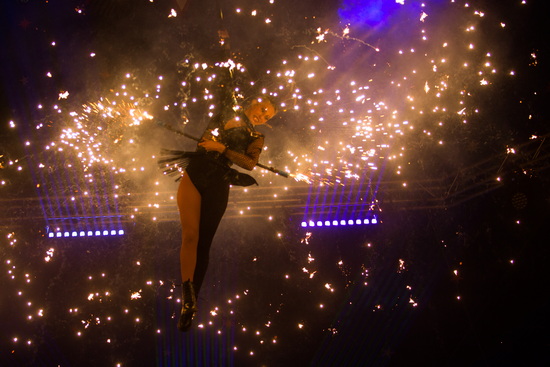 Scarlett Renz beherrscht das Spiel mit dem Feuer. Feurige Hula Hoop Ringe rotieren um den Körper – sowohl in der Manege, als auch hoch in der Kuppel in der sie an einer Handstrapate schwebt. Röhrenkubus und Twirlings wirbeln umher. Schließlich zündet die sympathische junge Frau Feuerwerkskörper während eines Pirouettenwirbels in der Kuppel und erzeugt einen Funkenregen, einem Kometenschweif gleich.