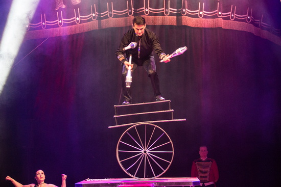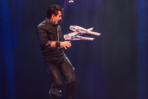 Einen umfangreichen und interessanten Auftritt absolviert David Arriola. Zunächst jongliert er höchst variantenreich mit Keulen. Es geht eine Treppe hinauf und hinab und viele Fußkicks fließen in den gekonnten Vortrag ein. Im zweiten Teil der Darbietung kombiniert der versierte Artist Aktionen auf der Rola Rola mit seinen Jonglagen. Nach dem Seil springen und einer Keulenjonglage auf der Rola wird zu Bounce-Routinen gewechselt.
