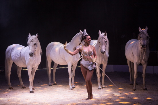 Selbstverständlich sind auch die erstklassigen Tierdressuren der Familie Renz in der Show zu erleben. Kimberley Scholl präsentiert eine neu zusammengestellte Freiheitsdressur mit vier weißen Araberhengsten. Souverän lässt die charmante Vorführerin die vielseitigen Figuren ablaufen, nachdem sie als Stehendreiterin auf einem prächtigen Kaltblut-Gespann die Manege einige Male umrundete. Einige gelungene Da Capo Steiger bilden den Abschluss des Auftritts.