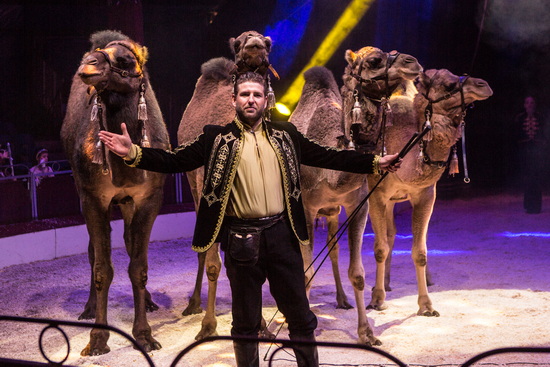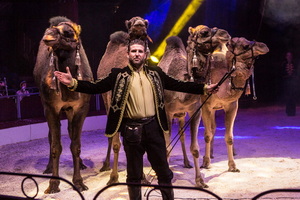 Ihr Partner Anthony Renz präsentiert eine abwechslungsreiche Arbeit mit vier Dromedaren. Gekonnt werden die vielfältigen Lauffiguren absolviert. Schließlich ergänzen Watussi-Rinder und Lamas den Exotenzug. Als kleine Zugabe können die Logenbesucher in direkten Kontakt mit den Lamas und Dromedaren kommen, indem sie das zuvor ausgeteilte Brot verfüttern.