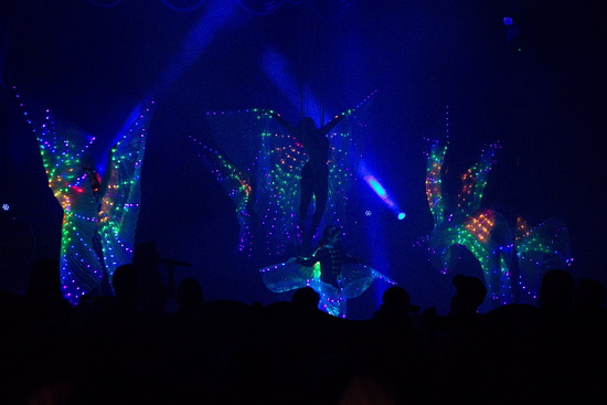 Im abgedunkelten Zelt beginnt die Show mit einem Serpentinentanz des hauseigenen Balletts, bei dem die mittels LED-Technik bunt beleuchteten Kostüme phantastische Bilder zaubern. Stimmiger Live-Gesang begleitet das gesamte Opening, in dem nun das gesamte Ensemble Kostproben seines Könnens zeigt.