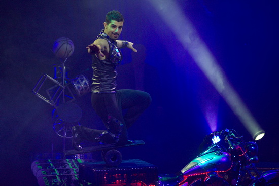 Kevin Chaves präsentiert seine furios vorgetragene Rola-Rola Darbietung auf einer kleinen Plattform, die auf einem schweren Motorrad montiert ist. Er springt auf dem labilen Untergrund Seil, schichtet vier Skateboards zu einem Turm und balanciert auf einem Ball. Der Höhepunkt seines Auftritts bildet die Balance auf einem Turm aus sieben Lagen unter dem Rollbrett.