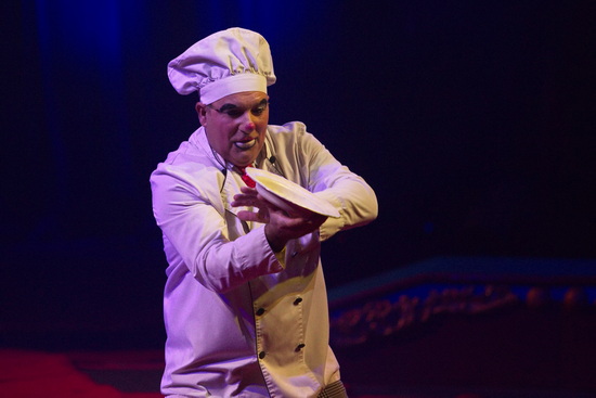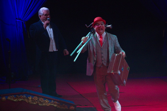 Die letzten Minuten bis zum Beginn der Vorstellung überbrückt Clown Angelo Chaves, der mit Logengästen scherzt und eine Flasche auf dem Stiel seines Besens jongliert.