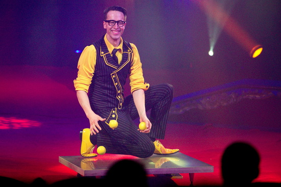 Bodenjongleur Ilja Smyslov manipuliert variantenreich bis zu sieben weiße Bälle. Souverän und fehlerfrei präsentiert er die verschiedenen Routinen.