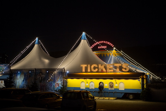 Auf dem Bendplatz, seit vielen Jahrzehnten der Festplatz der Stadt Aachen, strahlt der Circus im Schein unzähliger Lichter in der kalten Winternacht. Ein großes Rundkuppelzelt des Circus Maximum von Roman Zinnecker und ein zweimastiges weißes Vorzelt sind aufgebaut. Eine attraktive Fassade, vier große mit Circusmotiven bedruckte Spannbänder rahmen das Eingangsportal mit dem Logo des Circus ein, bildet einen gelungenen Blickfang. Der Tonnendach-Kassenwagen des Circus Maximum, ein weißer Zierzaun und Weihnachtsbäume komplettieren die Front.