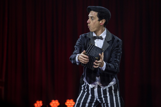 Clown Pepe Jardim ist in mehreren Reprisen zu erleben. Zunächst „sammelt“ er den Applaus des Publikums in ein kleinen Kasten. Wenig später dirigiert er das Spiel mit Glöckchen die er an Logenbesucher verteilt hat. Im dritten Auftritt wird mit Zigarrenkisten jongliert und schließlich stapelt er zehn Stück zu einem waagrecht aufgebauten Turm.