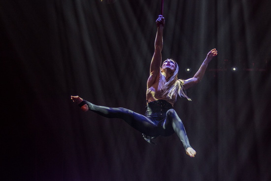 Zum „Bolero“ von Ravel arbeitet Tatiana Ozhiganova eine mitreißende Darbietung an den Strapaten. Perfekt abgestimmt auf den Rhythmus und das sich beständig steigernde Tempo der Musik steigert sich der Ablauf der Akrobatik.