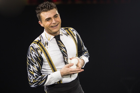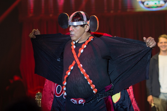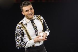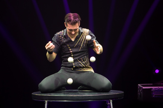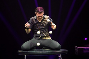 Als erster zeigte Michael Ferreri seine mitreißende Balljonglage. Er beginnt seine variantenreichen Routinen mit drei Requisiten. Immer wieder fällt ein weiterer Ball aus der Kuppel und erweitert die Muster. Schließlich sind es derer neun, die perfekt manipuliert werden. Effektvoll erfolgen zum Höhepunkt des Auftritts Muster mit acht in bunten Farben beleuchteten Bällen im abgedunkelten Zelt.