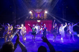 Schalensitzgradin und nostalgisch verzierte Logen sowie ein Artisteneingang aus rotem Samt füllen den weiten Raum des Chapiteau. Anstelle der Manege ist eine erhöhte Bühne vorhanden. Auf der Empore des Artisteneingangs hat ein Schlagzeuger seinen Platz und einige Weihnachtsbäume sorgen für das nötige Flair. Ein ca. 40cm hoher LCD-Bilschirm nimmt die gesamte Breite der Konstruktion ein. Auf ihn werden wechselnde, der jeweiligen Darbietung entsprechende Muster und Dekore projiziert.