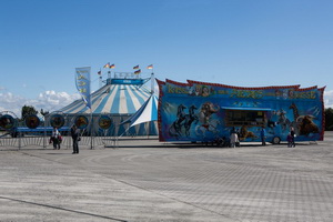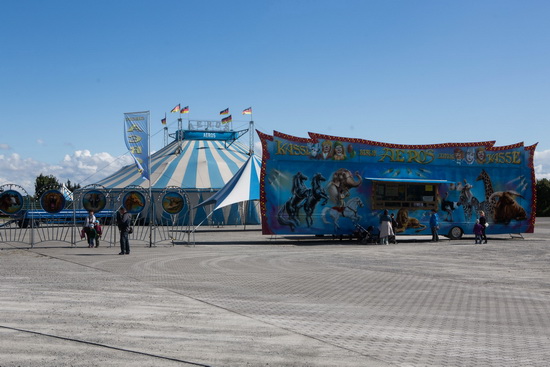 Das blau-weiß gestreifte Viermasten-Chapiteau von dreißig Metern Durchmesser wird von einer langgestreckten Kuppel, auf der zahlreiche Fahnen fröhlich wehen, gekrönt. Der neue voluminöse Stall, optisch passend zum Spielzelt, bietet den vielen Tieren des Circus Aeros eine komfortable und tiergerechte Unterkunft.
