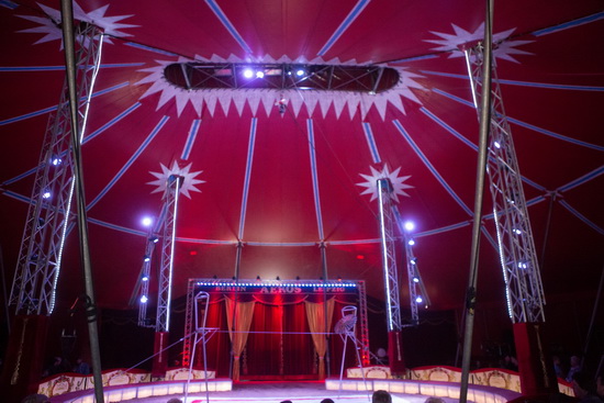 Das Chapiteau-Innere empfängt die Besucher mit einer warmen heimeligen Atmosphäre. Die rote Zeltplane ist mit einer weiß-blauen Gurtung versehen und die Stühle hinter den dekorativ in rot und gold verzierten Logenbrüstungen tragen rote Samthussen. Einen besonderen Blickfang bildet der große Artisteneingang. Ein Gitterrohrrahmen, mit zahlreichen Beleuchtungskörpern versehen, spannt sich um die prächtige Gardine aus dunkelrotem Samt. Geschmackvolle goldene Applikationen und Strass verzieren den schwer fallenden Stoff geben der Fläche Struktur. Gleiches gilt für die roten Samtverkleidungen an den Masten.