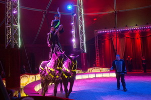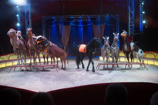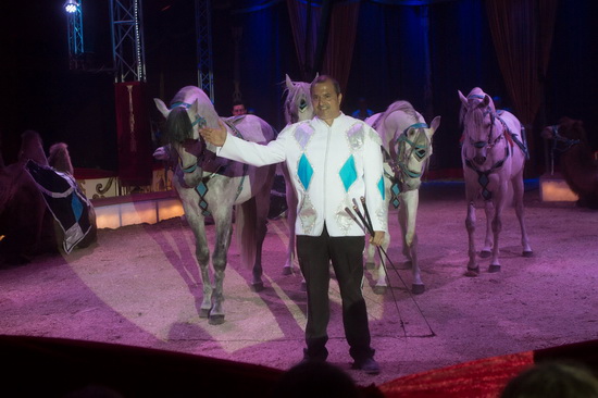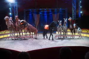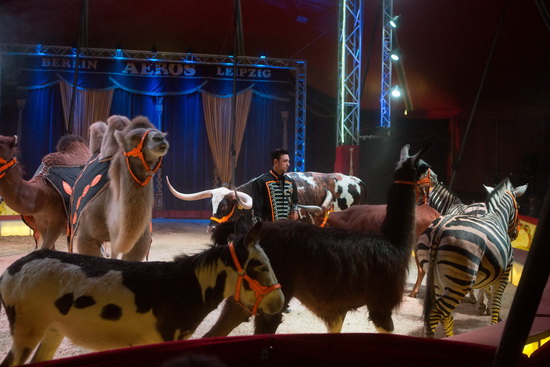 Als erste von mehreren exzellenten Dressur-Darbietungen präsentiert Christiano die Exoten des Hauses. Kamel, Dromendar, Lamas, Longhornrind, Zebras und Esel laufen unter der ruhigen und souveränen Peitschenführung des Tierlehrers ihre Figuren. Ein Friese läuft abschließend völlig selbstständig Achten um die auf zwei Tonneaus stehenden Tiere, ehe er sich mit dem tiefen durchstecken des Kopfes zwischen den, auf der Piste ruhendenden, Vorderhufen verabschiedet.