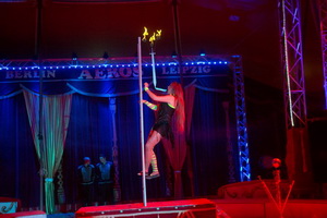 Juliana Schmidt ist eine eloquente Sprechstallmeisterin. Die sympathische junge Frau heißt das „hochverehrte Publikum“ herzlich willkommen, stellt redegewandt ihre Familienmitglieder vor und hält allerlei Informationen für die Besucher bereit. Zudem sehen wir Juliana im Verlauf der Show mit einer ausdrucksstarken Säbelbalance auf dem Piedestal. Ein Schwert und hernach eine hohe Stange mit einer Kugel auf der Spitze werden sicher auf der Stirn balanciert und über eine Leiter getragen. Höhepunkt ein Schwert mit drei brennenden Fackeln auf dem Knauf, das Spitze auf Spitze auf einem Munddolch ruht.