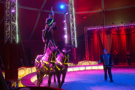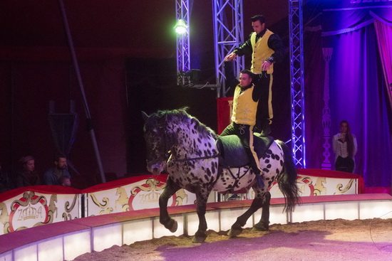 Die dynamische Jockeyreiterei der „Geschwister Aeros“ wird als trickstarke Pausennummer geboten. Christiano, Marvin und Denise beherrschen ein breites Repertoire hervorragend ausgeführter Tricks. Keulenjonglage auf dem kanternden Pferd, Salto vom Pferderücken in die Manege und diverse Sprünge auf das Pferd zeigen die beiden Herren nebst einer Reihe klassischer Jockey-Tricks, während Denise ihre diversen Voltige-Figuren in Vollendung zu präsentieren versteht. Temporeich werden die verschiedenen Elemente mit großer Sicherheit ausgeführt.