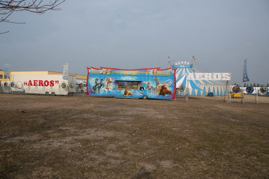 In einem Gewerbegebiet war der stattliche Circus großzügig aufgebaut. Der mächtige, prachtvoll gestaltete Kassenauflieger beherrscht die große elegante Front. Ein langgestreckter Zaun, dessen Felder in exzellenter Weise mit Tiermotiven in Airbrush-Technik gestaltet sind, flankiert den Fassadenwagen zu beiden Seiten.