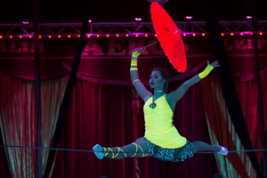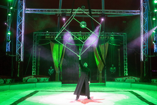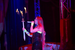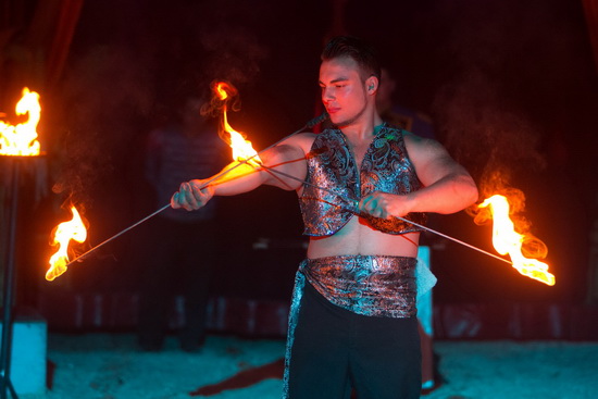 Mit einem Serpentinentanz leiten die vier Tänzerinnen des Balletts die Feuernummer von Marvin Frank ein. Meterhohe Feuersäulen stößt der Fakir in Richtung Zeltkuppel aus. Mit lodernden Fackeln streicht er über seine Arme und verlöscht die Flammen im Mund.