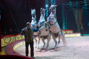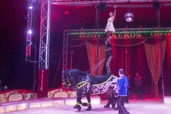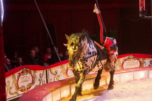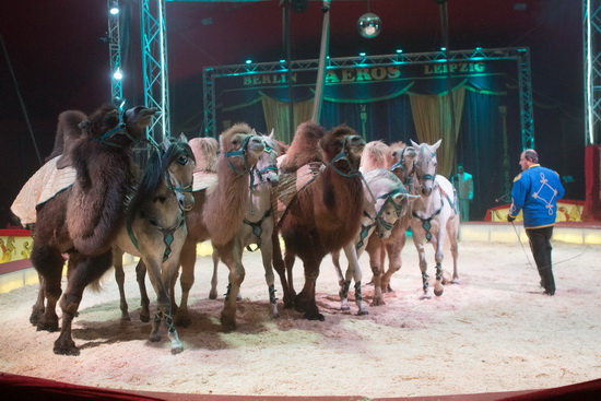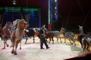 Die erste der exzellenten Dressur-Darbietungen präsentiert Christiano mit den Exoten des Hauses. Kamel, Dromendar, Lamas, Longhornrind, Zebras und Esel laufen unter der ruhigen und souveränen Peitschenführung des Tierlehrers ihre Figuren. Schließlich kommt ein Friese hinzu und läuft völlig selbständig Achten um die auf zwei Tonneaus stehenden anderen Tiere. Mit dem tiefen durchstecken des Kopfes zwischen den auf der Piste ruhenden Vorderhufen findet der Auftritt seinen gelungenen Abschluss.