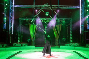Jan Szeibe präsentiert eine Jonglage mit einem Röhrenkubus. In eine lange schwarze Robe gekleidet wirbelt er das glänzende Requisit mit scheinbarer Leichtigkeit umher.