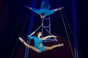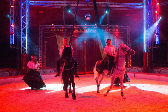 Zwei Tänzerinnen begleiten Chantal und Elena bei ihrer Hohen Schule im spanischen Stil in der Manege. Stimmungsvolle Bilder zaubert die harmonische Interaktion der Tänzerinnen und Reiterinnen in den roten Ring. Im zweiten Teil des Auftritts wechseln Chantal und Elena das Genre und präsentieren eine gelungene Trickfolge an den Strapatentüchern. Nach einigen gelungenen Partnertricks sorgen spektakuläre Abfaller für die notwendige Spannung auf den Rängen.