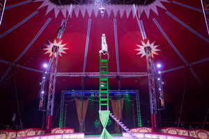 Eine weitere Luftnummer arbeitet Ashanti am Netz. Gekonnt werden die vielseitigen Tricks präsentiert und auch dieser Auftritt gewinnt durch Marvin, der mit seiner Trompete in der Manege für eine romantische Untermalung sorgt, an Publikumswirksamkeit.