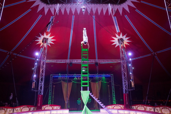 Erstklassige Handstandartistik präsentiert Christiano auf dem Flaschenstuhl. Auf einem sehr hohen Piedestal ruht der erste Stuhl auf vier passgenauen Stützen. Nach einem erstklassig und kraftvoll ausgeführte Handstand wird dem labilen Gebilde jeweils ein weiterer Stuhl hinzugefügt und schließlich bilden fünf von ihnen einen hohen Turm unter den Händen des Artisten. Zum gelungenen Abschluss des Auftritts läuft der Artist im Handstand die Treppe zur Manege hinab.