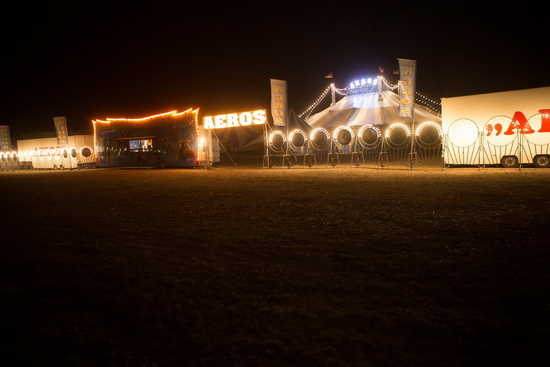 Das blau-weiß gestreifte Viermasten-Chapiteau wird von einer langgestreckten Kuppel, auf der der Namenszug in meterhohen beleuchteten Lettern prangt, gekrönt.