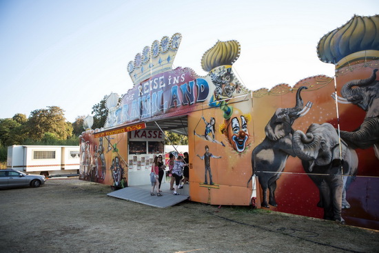 In Erfurt, der Landeshauptstadt Thüringens war der Circus auf einem Gelände in der Nähe der Thüringen-Halle aufgebaut. Die große und prächtig mit Elefanten, Steigerpferden und Clownsköpfen bemalte Fassade lädt zum Besuch des Circus ein. Eine „Reise ins Traumland“ verspricht die Beschriftung und tausende funkelnder Lichter transportieren in den Dunkelheit charmant den Zauber des Circus. Im Durchgangsbereich des Wagens sind die Kassenschalter untergebracht.
