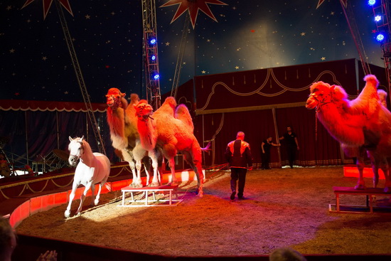 Der Chef des Hauses, Hardy Weisheit, lässt drei Kamele in einer temperamentvoll vorgetragenen Abfolge ihr erlerntes Können zeigen. Gekonnt und souverän werden die unterschiedlichen Lauffiguren aneinander gereiht. Abschließend umrundet ein Araberhengst die auf Tonneaus stehenden Trampeltiere und präsentiert sich als erstklassiger Steiger.