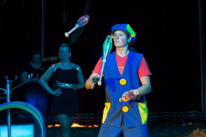 „Pepino“, alias Jeffrey Weisheit, sehen wir darüber hinaus mit einer Tempojonglage. Tennisbälle, Ringe und Keulen werden von dem jugendlichen Artisten virtuos beherrscht. Sehr sicher manipuliert und variantenreich manipuliert er seine Requisiten.