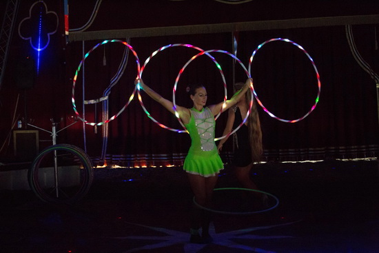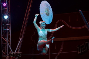 Mehrere Darbietungen sehen Miss Charmaine als vielseitige Akteurin. Zunächst präsentiert sie ihr Können mit den Hula Hoop Reifen. Im abgedunkelten Zelt kreisen die per LED-Technik beleuchteten Ringe in vielerlei Varianten um den Körper der sympathischen Artistin. Wenig später folgt der Auftritt am Luftring. Elegant und kraftvoll in der Ausführung folgen die Haltetricks und Balancen aufeinander. Raumgreifende Flüge komplettieren die formidable Darbietung. Im zweiten Prgrammteil arbeitet Miss Charmaine ihre erstklassige Trickfolge am Vertikalseil. In weiten Schwung kreist sie in tempogeladen hoch in der Kuppel. Vielerlei spektakuläre und teils auch risikoreiche Abläufe erfolgen mit großer Souveränität und zum Höhepunkt ihrer Evolutionen lässt sich die versierte Artistin an einem Arm voll ausdrehen.