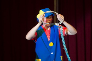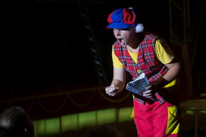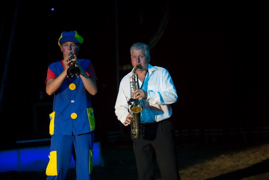Für den Frohsinn im Programm sind die Auguste „Pepino“ und „Zampano“ zuständig. Die Szene mit dem Gummiband und das Spiel mit Popcorn gehören u.a. zu ihrem Repertoire. Ein Pony verweigert den Hürdensprung bis es vom August höflich gebeten wird. Gemeinsam mit einem Zuschauer-Kind gelingt es den beiden Spaßmachern eine laut brüllende „Bestie“ hinter dem Vorhang hervor zu locken. Im umfangreichsten Auftritt wird das Kunstschützenentree gespielt, in dem Hardy Weisheit die Rolle des Weißclowns übernimmt. Schwungvoll geht das Trio zu Werke und mit gekonntem Spiel auf Trompete und Saxophon wird eine stimmungsvoller Background geboten.