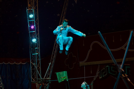 Die Geschwister Weisheit, Ashley und Jeffrey, sind zu Beginn des zweiten Programmteils auf dem Drahtseil zu erleben. Zunächst zeigt eine Ashley vielfältige Schrittkombinationen und sicher ausgeführte Balancefiguren. Auf diesen anmutig vorgetragenen und eher tänzerisch betonten Teil der Darbietung folgen die mehr akrobatisch geprägten Aktionen von Ashley. Der junge Mann jongliert auf dem Seil mit drei Macheten und zeigt eine Reihe schnell und hoch ausgeführter Sprünge über diverse Barrieren. Mit gekonntem Seil springen beschließt er den Auftritt.