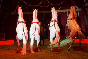 In weiteren Verlauf der Vorstellung präsentiert Hardy Weisheit die Cavallerie des Hauses. Vier temperamentvolle schneeweiße Araberhengste beherrschen ein umfangreiches Repertoire unterschiedlicher Lauffiguren, das in erstklassiger Manier unter der souveränen Peitschenführung des Direktors abläuft. Als Da Capo werden verschiedene Steiger geboten, die die Darbietung in idealer Weise abrunden.