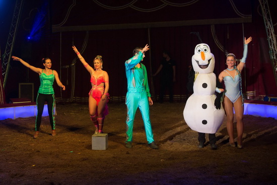 Mit einem schwungvollen Opening, in dem die „Eiskönigin Elsa“ und „Schneemann Olaf“ zusammen mit einer afrikanischen Elefantendame in der Manege präsent sind, beginnt die Spielfolge. Frau Direktor Weisheit begrüßt charmant ihr Publikum und gibt die Manege für die erste Darbietung frei.