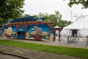 In Zeist war der schmucke Circus direkt neben dem aus dem 16. Jahrhundert stammenden Schloss Zeist aufgebaut. Die drei prächtigen, mit großflächigen Circusmotiven bemalten Fassadenwagen des Unternehmens geben sofort einen positiven Eindruck dieses schönen, traditionsreichen Circus. Zahllose Glühbirnen formen am mittleren Wagen, der zudem die Kassenschalter beherbergt, den Circusnamen und Spannbänder auf den Dächern der beiden flankierenden Fahrzeuge zeigen in meterhohen Lettern den Schriftzug „Circus Show“. Ein neuer dekorativer Frontzaun komplettiert das Arrangement.