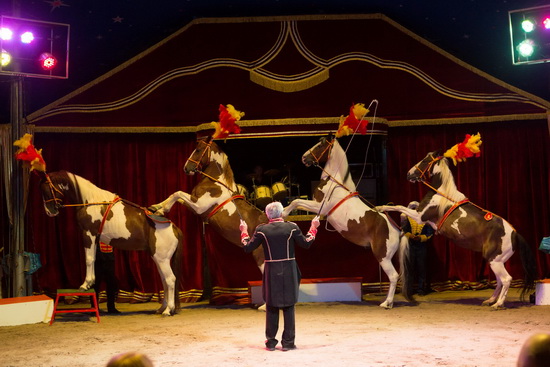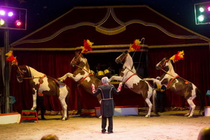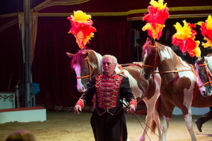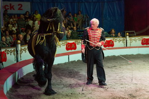 Vor voll besetztem Haus eröffnet Direktor Stefan Frank die Spielfolge mit einer meisterhaften erstklassigen Pferdedressur. Die vier dekorativen Pintoschecken laufen unter der schwungvollen Peitschenführung des erfahrenen Dresseurs ihre Figuren gekonnt ab. Per Stimme dirigiert er die Pferde zum abliegen und anschließendem aufrichten. Der eindrucksvolle und heute nicht mehr oft gezeigte Kruppensteiger bildet den Höhepunkt der Darbietung.