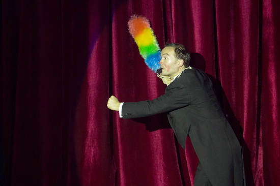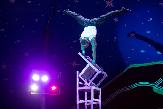 Marcel brilliert mit seiner Handstandequilibristik. Auch diese Nummer ist liebevoll gestylt und erzählt eine Geschichte. Im Outfit eines „Bauarbeiters“ werden die ersten Handstände auf zwei Stühlen die in der Manege stehen ausgeführt. Weiter geht es auf einem hohen schlanken Piedestal. Nach und nach errichtet er hier seine Stuhlpyramide und arbeitet sich mit erstklassig ausgeführten Handständen in die Höhe. Schließlich türmen sich fünf Stühle zu einem labilen Turm auf dem Piedestal und von der obersten Sitzfläche entrollen sich lange Leinwände, die mit einem Bild des Empire State Building bedruckt sind. Auf diesem „Wolkenkratzer“ erfolgt ein Handstand unmittelbar in der Zeltkuppel.