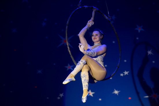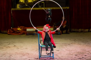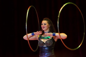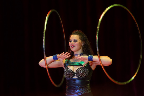 Lesley Frankordi ist mit mehreren Darbietungen in der Alberti-Manege zu erleben. Zunächst präsentiert die charmante und vielseitige junge Frau ihr Können mit den Hula Hoops. Temperamentvoll lässt sie die Reifen in vielerlei Variationen um ihren Körper kreisen.