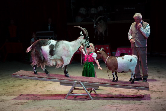In einem weiteren Auftritt findet der agile Chef des Hauses tatkräftige Unterstützung durch seine Enkelinnen Elaine und Louisiana bei der Präsentation von drei Ziegen. Voller Begeisterung agieren die Mädchen im roten Ring und leiten wechselweise mit dem stolzen "Opa" die Tiere zu ihren Tricks an. Eine Balance über eine Planke, die auf dem Rücken zweier Pferde lagert, beschließt die Nummer.