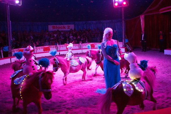 Wenig später erleben wir, zumindest für die zahlreichen Kinder, den Höhepunkt des Programms. Lesley Frank verkörpert „Elsa die Eiskönigin“ und präsentiert in Begleitung des Schneemanns „Olaf“ einen Sechser-Zug Shetland-Ponys. Deren Geschirre funkeln im Licht unzähliger LED-Schnüre und „Olaf“-Figuren sitzen auf ihren Rücken. Munter trippeln die Minipferdchen ihre Figuren in den Sand und zur großen Freude der kleinen Besucher trickst ein Pony die Vorführerin bei den Barrieresprüngen aus.