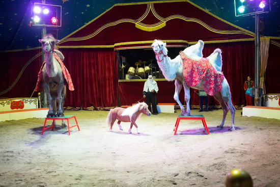 Direktor Stefan Frank, alias „Ali ben Hassani“, steht im Mittelpunkt der finalen Darbietung. Souverän leitet er die Kamelkarawane des Circus Alberti zu ihren Figuren an. Die vier prächtigen, mit Schabracken geschmückten Trampeltiere bieten in fehlerfreiem Ablauf variantenreiche Lauffiguren. Ein Pony, das Achten um zwei auf Tonneaus stehende Kamele läuft, ist gleichfalls in die Darbietung integriert.