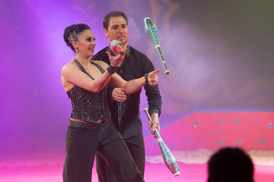 Der Schwung des harmonischen Eröffnungsbildes setzt sich in der Jongleur-Darbietung des italienisch-spanischen Duo Jarz fort. Zunächst werden mit silbernen Keulen etliche Partnerroutinen ausgeführt. Sodann sind Tennisbälle, die Ivano Jarz auch in Köchern am Gürtel fängt, die Utensilien der Wahl. Fliegenden Untertassen gleich segeln Teller durch die Kuppel und finden stets sicher in die Hand des Jongleurs zurück. Mit einem großen Röhrenkubus werden die abschließenden Touren geboten.