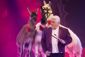 Die drei, mit Pailletten besetzten Halftern und Halsbändern prachtvoll herausgeputzten Lamas, laufen nun unter der versierten Peitschenführung von Pierre Paillé ihre erlernten Figuren. Sie steigen auf ein Podest und mit gekonnten Barrieresprüngen klingt der Auftritt aus.