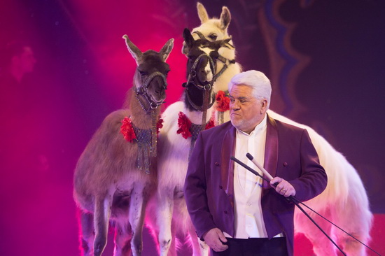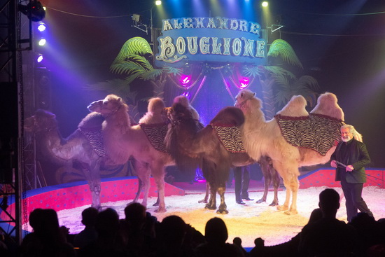 Direktor Alexandre Bouglione präsentiert vier prächtige Steppenkamele in einer harmonischen Laufarbeit. Souverän lässt der erfahrene Tierlehrer die verschiedenen Abläufe ausführen. Als Da Capo präsentiert ein temperamentvoller Hengst erstklassige Steiger.