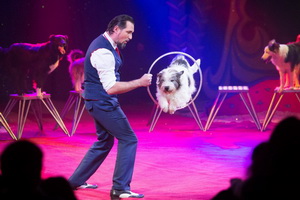 Juniorchef Nicolas Bouglione bringt seine verspielte Hundemeute in die Manege. Sechs schwarz-weiße Hunde unterschiedlicher Größen und Rassen zeigen voller Eifer ihr erlerntes Können. Zahlreiche Sprünge bilden den Schwerpunkt der temperamentvoll vorgetragenen Darbietung.