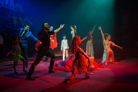 Die Lichter flammen auf und das versammelte Ensemble eröffnet mit einem bunten Charivari die Show. Mit Rola-Rola, Jonglage, Hula Hoop und Hand-auf-Hand Elementen wird das Bild gestaltet. Die Manege leert sich und ein Tuch, das eine seltsame Gestalt verbarg, wird entfernt.