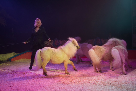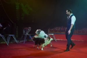 Von den zahlreichen hauseigenen Dressur Darbietung sind derzeit die verspielte Hundemeute von Nicolas Bouglione und sechs Shetlandponys, vorgeführt von Linda Bouglione in der Show zu erleben. Munter trippeln die Minipferde durch den Manegensand. Auffußen auf der Piste und Barrierensprünge sind, neben den verschiedenen Lauffiguren die Elemente der Darbietung.
