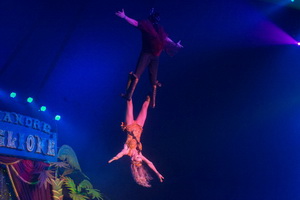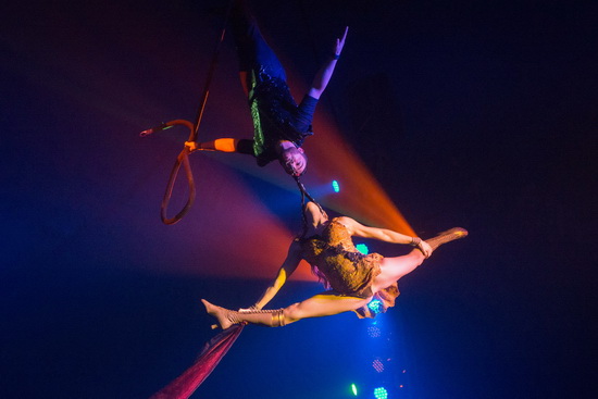Eine faszinierende, außergewöhnliche Darbietung am Vertikalseil arbeitet das rumänische „Duo Endless Love“. Die Partnertricks mit riskanten Abfallern werden ohne Vorteil ausgeführt und nutzen mit weiten Flügen den Raum in der Kuppel. Besonders spektakulär sind die Passagen in der Porteur sich nur im Zahnhang an Requisit hält und die Partnerin an seinen Füßen hängt.