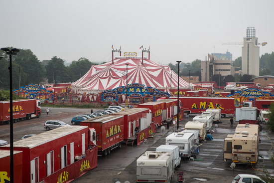 Selbstverständlich wird auch dieser große Circus, wie in Frankreich allgemeine Praxis, in einer einzigen Fahrt auf der Straße umgesetzt. Mehr als fünfundzwanzig einheitlich in rot, mit weißen Absetzungen lackierte Renault Magnum und Scania Zugmaschinen stehen bereit, jeweils einen Sattelauflieger mit angekuppeltem Jumboanhänger oder mehrere Anhänger zu transportieren.