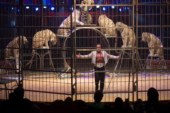 Der Zentralkäfig steht schon während des Einlasses bereit und John Falck startet die Programmfolge mit seiner Raubtierdressur. Sechs weiße und ein normalfarbener Tiger bilden eine Pyramide, sitzen in der Manegenmitte und am Platz hoch, zeigen einen Fächerlauf und liegen ab. Der souverän präsentierte Auftritt bietet eine umfangreiche Trickfolge, in der auch eindrucksvolle Vorwärts- und Rückwärtssteiger zweier Tiger nicht fehlen.